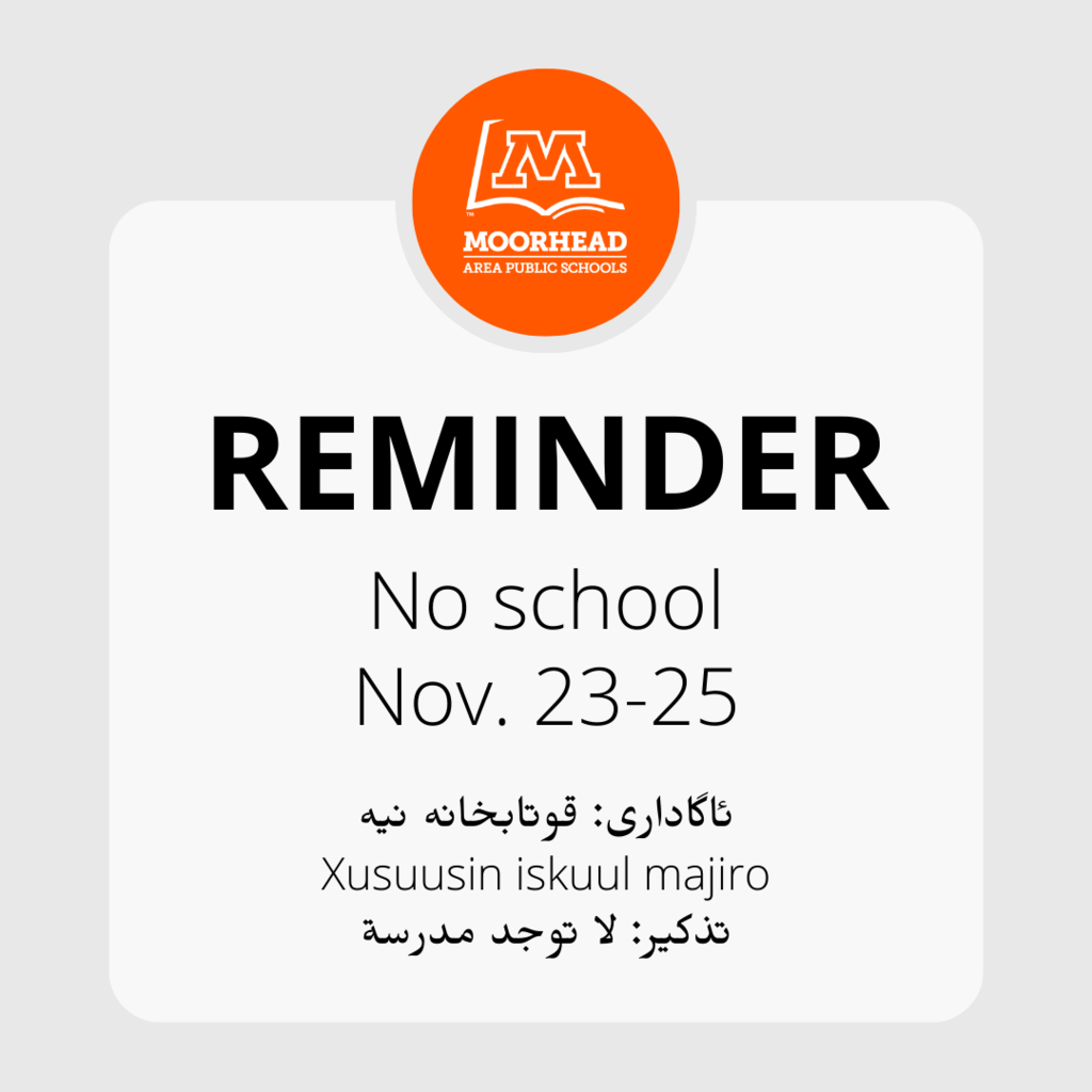 ๐ถ REMINDER ๐ถThere will be no school for Moorhead students from Wednesday, November 22, to Friday, November 24. Classes will resume on Monday, Nov. 27.